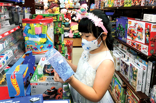 Các sản phẩm đồ chơi, phụ kiện làm đẹp… được nhiều bé gái ưa chuộng và lựa chọn trong dịp 1-6. Trong ảnh: Khách hàng nhí chọn mua đồ chơi tại nhà sách Phương Nam.
