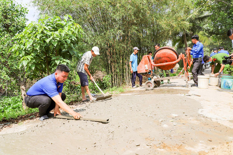 Anh Phạm Quốc Tịnh (bên trái) cùng đoàn viên thanh niên tham gia nâng cấp đường giao thông. Ảnh: HỒNG VÂN