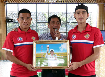 Ông Trần Minh Tâm (giữa), Trưởng đoàn bóng đá Cần Thơ, trao bức ảnh cho Văn Thắng (trái) và Tiến Thành. |