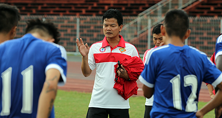 HLV Nguyễn Văn Sỹ căn dặn học trò trong buổi tập trên sân Cần Thơ. Ảnh: Nguyễn Minh