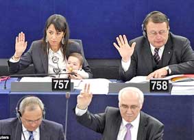 Hôm 8-3 vừa qua, nữ nghị sĩ Licia Ronzulli lại đưa con gái 7 tháng tuổi của mình đến dự phiên họp của Nghị viện châu Âu ở Strasbourg (Pháp). Cô bé Victoria Ronzulli ngồi cùng bàn với mẹ và có vẻ chăm chú lắng nghe cuộc họp (ảnh). Theo qui định của Nghị viện châu Âu, các nghị sĩ được phép mang con đến chỗ làm. Tháng 9 năm ngoái, bé Victoria lần đầu tiên được mẹ đưa đi dự khi mới tròn 1 tháng và ngoan ngoãn ngủ yên trong vòng tay của mẹ. Sự kiện trên đã gây khá nhiều sự kinh ngạc và thu hút sự quan tâm của giới truyền thông lúc bấy giờ.