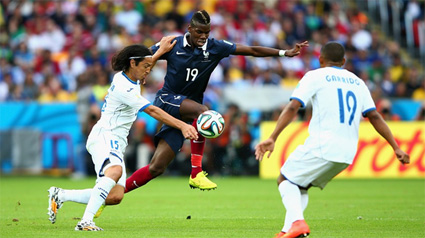 Paul Pogba (19) tranh bóng với Roger Espinoza của Honduras. Ảnh: Getty |