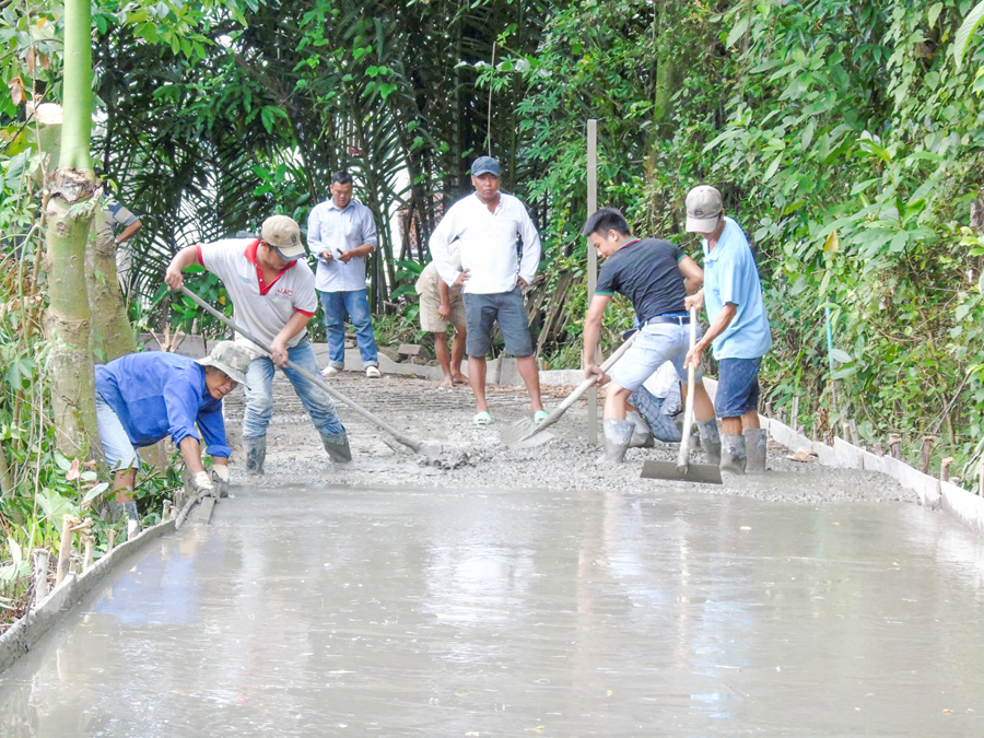 Trở lại tuyến đường ấp Thới Giai khi các công nhân khẩn trương đổ bê tông mặt đường trong niềm vui phấn khởi của bà con. Tuyến đường dài 2.000m được các cán bộ xã vận động mạnh thường quân hỗ trợ khoảng 1,8 tỉ đồng thực hiện bê tông. Bà Nguyễn Thị Sáu, người dân ấp Thới Giai, chia sẻ: “Trước đây, mặt đường thấp, xuống cấp nên có những đoạn khi mưa lớn đọng nước hoặc khi triều cường dâng cao lại bị ngập, khó khăn trong việc đi lại cũng như sinh hoạt và làm cho cảnh quan không đẹp. Giờ đường được nâng cấp cao ráo, sạch đẹp, bà con phấn khởi lắm”. Trước đó, tuyến đường Ngã Cái - Ông Tường dài 1.214m do cán bộ xã vận động bà con đóng góp hơn 388 triệu đồng cùng với huyện hỗ trợ hơn 1.800 bao xi măng bê tông đường.