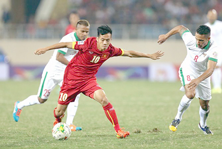 Pha đi bóng của Văn Quyết (số 10) trước các cầu thủ Indonesia. Ảnh: sivertimes.