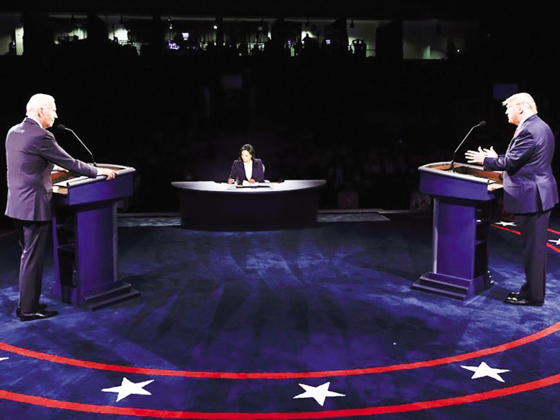 Tổng thống Trump (phải) và đối thủ Biden trong cuộc tranh luận sáng 23-10. Ảnh: AP