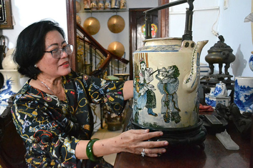 Với tôi, bà Quyên là trường hợp đặc biệt nhất trong số những người chơi gốm cả nước tôi biết được. Ở bà có tình yêu gốm mãnh liệt đến mức suy tôn gốm Nam bộ xưa như ngôi đền thiêng và tự đặt cho mình là tín đồ trung thành mang sứ mệnh gìn giữ ngôi đền ấy. “Tôi quyết định mua bức tượng Quan âm Tara chỉ trong “1 nốt nhạc” khi biết được có nhà sưu tập nước ngoài quan tâm”. Chưa hết ngạc nhiên, khi biết số tiền mua bức tượng tương đương chiếc xe 4 chỗ hạng bình dân, tôi càng trân trọng hơn khi được bà tiết lộ đã nhờ chồng lái xe đi nhận pho tượng ngay trong đêm vì lo bị nhà sưu tập nước ngoài “hớt tay trên”. Không chỉ dốc túi sưu tầm, bà còn vắt cả tim óc chăm sóc sau khi sở hữu món đồ. Vì thế, khác với nhiều bộ sưu tập gốm mà tôi có dịp tìm hiểu trên các nẻo đường tác nghiệp, bộ sưu tập của bà Quyên lên đến hàng ngàn hiện vật, nhưng lại mang đến người xem cảm giác rất nhẹ nhàng.