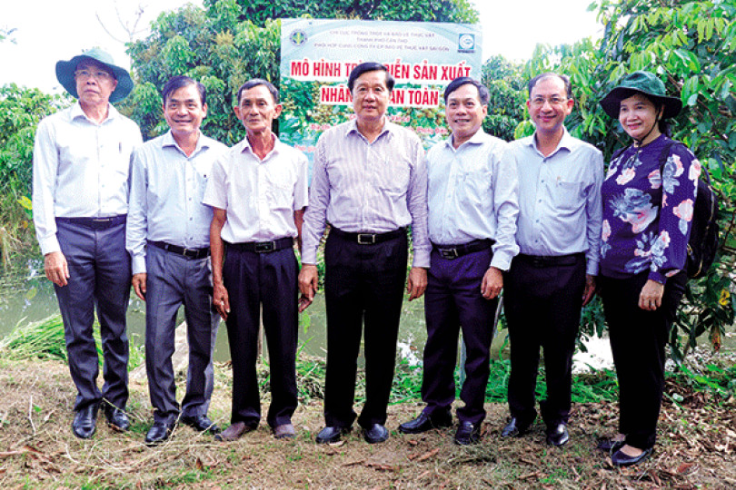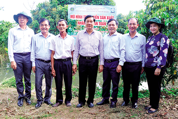 Lãnh đạo TP Cần Thơ thăm hỏi tình hình sản xuất của nông dân tại HTX nhãn Nhơn Nghĩa, huyện Phong Ðiền. Ảnh: CTV