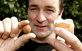 Nông dân Jeff Taylor 40 tuổi ở Ross-on-Wye, Hereford (Anh) rất ngạc nhiên khi thấy một quả trứng gà nguyên vẹn bên trong quả trứng luộc lớn hơn mà anh vừa bóc vỏ để ăn sáng (ảnh). Anh cho biết hai quả trứng đều có cấu tạo hoàn chỉnh. Douglas Russell, chuyên viên phụ trách bộ sưu tập về trứng tại Bảo tàng lịch sử tự nhiên Anh cho biết đây là một trường hợp “vô cùng hiếm hoi” khi một quả “trứng kép” đến được tay khách hàng. Rất nhiều giả thuyết được đặt ra về nguyên nhân tạo nên “trứng trong trứng” nhưng theo ông, giải thích có vẻ hợp lý nhất là do “trục trặc” trong nhu động, tức là “sự cố” trong việc chuyển động phối hợp nhịp nhàng để chuyển một trứng đang phát triển xuống vòi trứng.