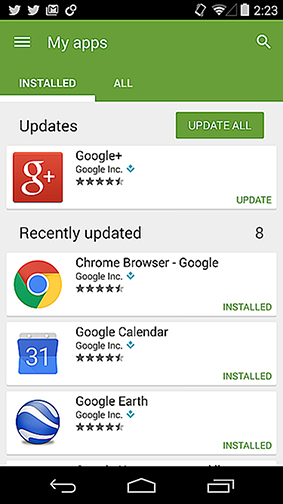 Sau khi đã chọn được thời điểm thích hợp nhất là lúc bạn rảnh rỗi hay không có nhiều việc cần sử dụng điện thoại, bạn tiến hành cập nhật các ứng dụng đã cài đặt trên thiết bị Android bằng cách mở ứng dụng "Play Store", nhấn nút "Menu", rồi tiếp tục chọn "My apps" trong danh sách được mở ra. Sau đó, bạn hãy mở màn hình "Installed" và tìm kiếm nút "Update" ở cột bên phải, chỉ xuất hiện ở những ứng dụng đã có bản cập nhật.