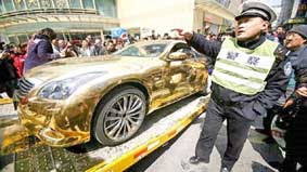 Một cửa hàng ở tỉnh Giang Tô (Trung Quốc) đã nảy ra ý tưởng độc chiêu: mạ vàng hết chiếc xe hơi của họ và trưng bày trước cửa để thu hút khách đến mua sắm. Tuy nhiên, chiêu thức quảng cáo trên đã nhanh chóng bị cảnh sát dẹp bởi xe không có gắn biển số và gây rối trật tự đường phố. Nhiều người lái xe gần cửa hàng đã giận dữ gọi cảnh sát giúp đỡ vì đường bị kẹt cứng do người dân bu lại chiêm ngưỡng “xe vàng” (ảnh). Cảnh sát cho biết nếu chủ xe không đóng tiền phạt trong vòng 10 ngày, xe sẽ bị bán hoặc bị nghiền nát.