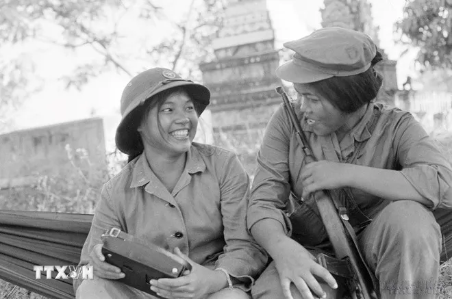Hai nữ chiến sỹ Việt Nam và Campuchia sát cánh bên nhau. (Ảnh: TTXVN)