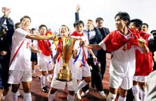 2 - Đội tuyển bóng đá Việt Nam (ảnh) lần đầu tiên đăng quang ở Giải bóng đá AFF Suzuki Cup 2008 đầy ấn tượng. Trên đường tới đỉnh vinh quang, đội tuyển của chúng ta khởi đầu có phần trục trặc nhưng càng vào sâu trong giải càng đá hay và lần lượt loại đương kim vô địch Singapore và vượt qua địch thủ Thái Lan ở 2 lượt chung kết (thắng 2-1 trên đất Thái và hòa 1-1 tại sân nhà Mỹ Đình). Thủ môn Dương Hồng Sơn còn được danh hiệu cá nhân “Cầu thủ xuất sắc nhất giải”.