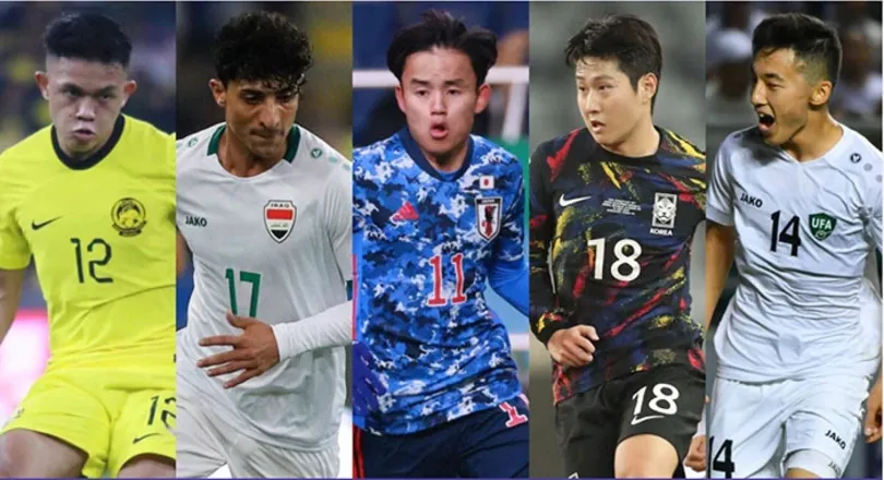 Arif Aiman, Ali Jasim, Takefusa Kubo, Lee Kang-in, và Abbosbek Fayzullaev (từ trái qua) - 5 tài năng trẻ hứa hẹn sẽ tỏa sáng ở Asian Cup 2023. Ảnh: AFC