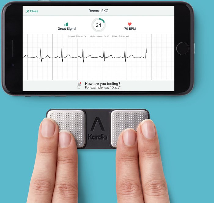 Trong trường hợp có tiền sử biến chứng sức khỏe tim mạch, bạn có thể mua một thiết bị bổ sung như Kardia Mobile, dùng đo nhịp tim nhanh (nhanh hơn 120 bpm) và nhịp tim chậm (chậm hơn 40 bpm). Kardia Mobile lấy điện tâm đồ thông qua tấm lót ngón tay (ảnh) và bạn có thể gắn vào mặt sau của điện thoại.