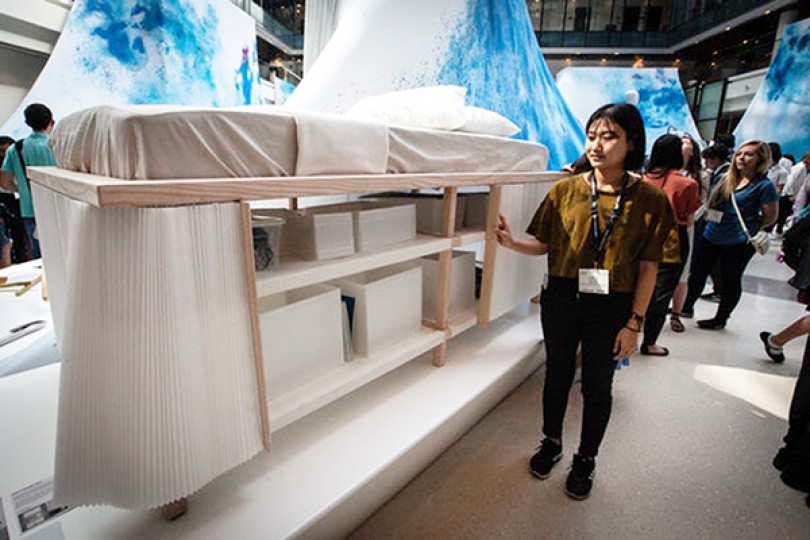 Nhằm tiết kiệm không gian cho căn hộ có diện tích nhỏ, nhà sáng chế sinh viên Yesul Yang đến từ Đại học Nghệ thuật và Thiết kế Lausanne (Thụy Sĩ) giới thiệu mẫu giường đa năng “Tiny Home Bed”. Sản phẩm gồm một tấm nệm đơn đặt trên chiếc giường bằng gỗ lớn có thể nâng lên cao, cho phép người dùng có thêm không gian đựng đồ bên dưới.