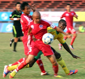 Chỉ có các cầu thủ QNK Quảng Nam (trái) chơi quyết tâm ở vòng sơ loại Cúp quốc gia. Ảnh: MINH THẢO |