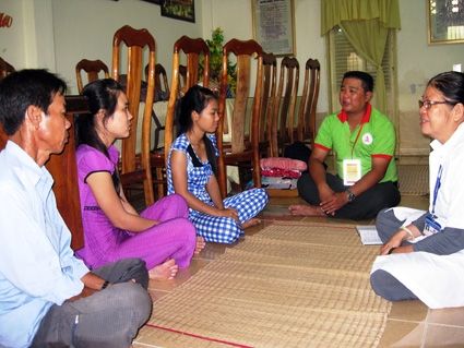 Đại diện Ban Điều phối chương trình TSMT năm 2014 (do Ban Hướng dẫn Phật tử Trung ương phối hợp với Báo Giác Ngộ tổ chức) thăm hỏi, động viên thí sinh Trần Thị Tuyết Sương (thứ 2, từ trái). Ảnh: B. NG