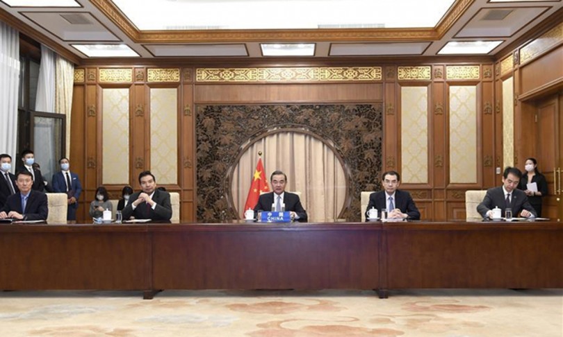Ngoại trưởng Trung Quốc Vương Nghị (giữa) trong cuộc họp trực tuyến với ngoại trưởng các nước Nam Á hôm 27-4. Ảnh: Xinhua