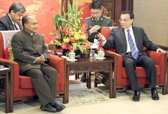 Bộ trưởng Quốc phòng Ấn Độ AK Antony (trái) và Thủ tướng Trung Quốc Lý Khắc Cường trong buổi gặp tại Thủ đô Bắc Kinh. Ảnh: PTI |