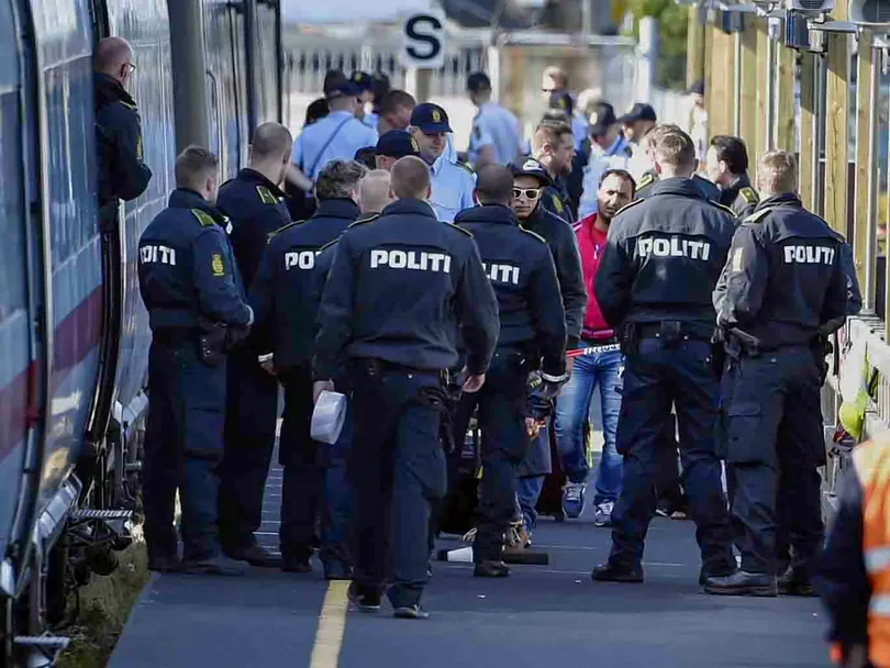 Cảnh sát Đan Mạch giám sát một chuyến tàu chở người di cư đến từ các nước Trung Đông. Ảnh: AFP