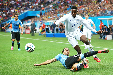 Danny Welbeck (11) đi bóng vượt qua hậu vệ Martin Caceres của Uruguay. Ảnh: Getty.