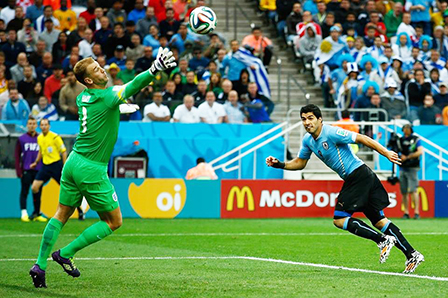 Hơi kém hơn về tỷ lệ kiểm soát bóng, nhưng các cầu thủ Uruguay tấn công nhịp nhàng và nguy hiểm hơn. Phút 38, Cavani có bóng bên cánh trái chuyền vào cho Suarez di chuyển thông minh thoát khỏi sự đeo bám của hàng thủ tuyển Anh. Bằng một cú lắc đầu kỹ thuật, Suarez đưa bóng vào góc xa, mở tỷ số cho Uruguay. Ngay sau bàn thua, các cầu thủ Anh có đường lên bóng tấn công nguy hiểm khi Wayne Rooney tỉa bóng để Sturridge băng xuống tung cú sút cực mạnh buộc thủ môn Fernando Muslera đẩy bóng ra. Phút 57, Rooney lại có cơ hội khi anh tung cú sút cận thành, nhưng bóng đi đúng vị trí thủ môn của Uruguay, không thể thành bàn thắng san bằng tỷ số.