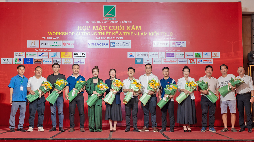 Đại diện AREUS by BM Windows (thứ 6 từ trái sang) nhận hoa lưu niệm từ Hội KTS TP Cần Thơ. Ảnh: MINH HUYỀN