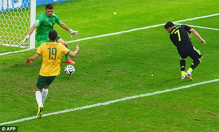 Phút 21, tình huống thật sự nguy hiểm đầu tiên thuộc về Tây Ban Nha, Iniesta chuyền bóng cho Villa bắt vô-lê, nhưng bóng đi chệch cột dọc Australia. Tây Ban Nha đã lấy lại thế trận, tạo ra một số tình huống nguy hiểm về phía khung thành tuyển Australia nhưng bàn thắng vẫn chưa đến. Australia vẫn chưa có pha bóng nào uy hiếp khung thành Reina. Trận đấu đang diễn ra tẻ nhạt thì bất ngờ Villa mở tỉ số cho Tây Ban Nha ở phút 36 của trận đấu. Villa đã có cú đánh gót điệu nghệ ngay vạch 5m50 từ đường chuyền vào của Juanfran ở ngay sát đường biên ngang. Đây cũng là bàn thắng duy nhất trong hiệp đấu thứ nhất.