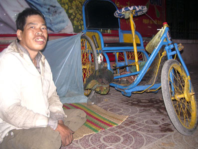 | Anh Nguyễn Văn Minh, bên chiếc xe lăn trong nhà chờ xe buýt ở đường Nguyễn Trãi, quận Ninh Kiều. |