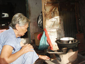 Bà Nhì lặng lẽ bên nồi cháo trắng. |