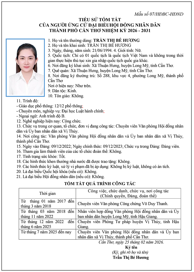 Bà Trần Thị Bé Hương – Chuyên viên Văn phòng HĐND và UBND xã Vị Thủy, thành phố Cần Thơ