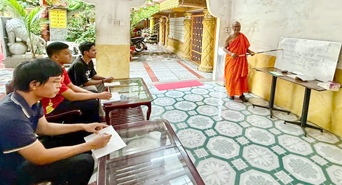 Hòa thượng Lý Hùng dạy chữ Khmer cho con em đồng bào dân tộc Khmer. Ảnh: CTV