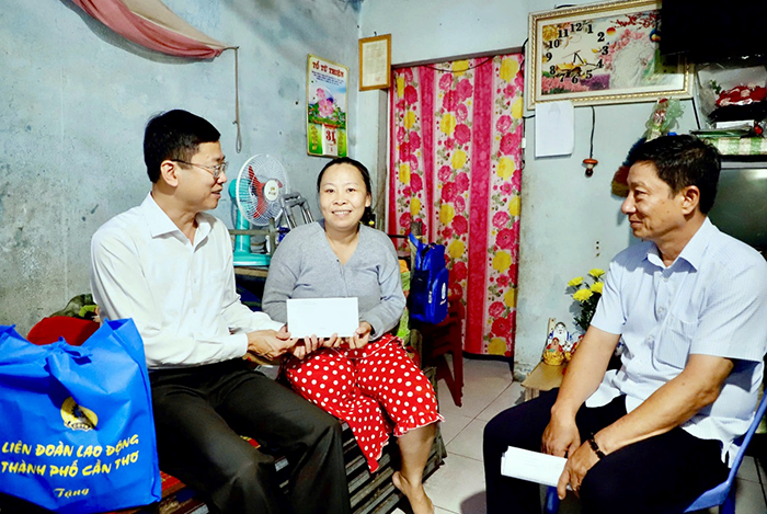 Ông Tiêu Minh Dưỡng, Phó Giám đốc Sở Nội vụ thành phố, thăm hỏi, động viên và trao quà tặng người lao động bị tai nạn lao động. Ảnh: CTV