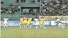Pha chạy lấy đà sút phạt “siêu phẩm” của Được Em (phải).