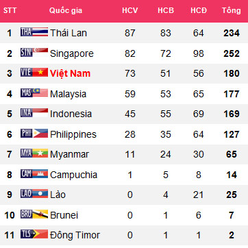 Bảng tổng hợp huy chương SEA Games 28 (tính đến 21 giờ ngày 14-6)