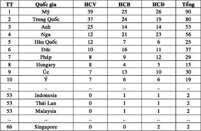 BẢNG TỔNG SẮP HUY CHƯƠNG OLYMPIC LUÂN ĐÔN 2012 (Tính đến 19h ngày 10-8-2012)