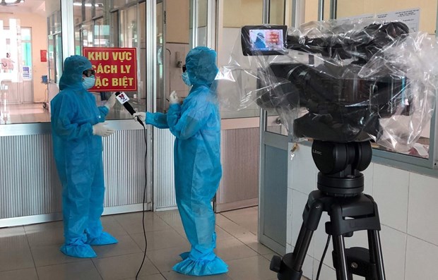 Phóng viên Thông tấn xã Việt Nam tác nghiệp tại khu vực cách ly đặc biệt. (Ảnh: Quốc Dũng/TTXVN)