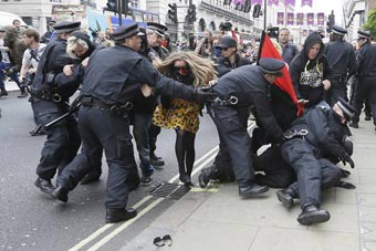Cảnh sát trấn áp người biểu tình tại trung tâm Thủ đô Luân Đôn. Ảnh: Standard |