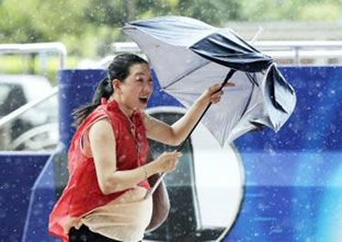 Một phụ nữ Đài Loan trên đường phố Đài Bắc trước cơn gió giật dữ dội. Ảnh: Reuters