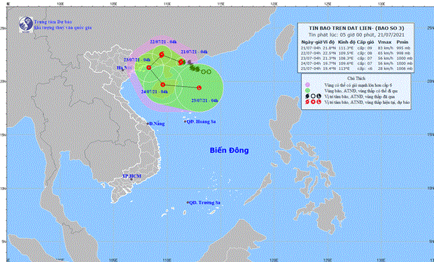 Cụ thể, lúc 4 giờ ngày 21/7, vị trí tâm bão ở khoảng 21,8 độ Vĩ Bắc; 111,3 độ Kinh Đông, ngay trên đất liền ven biển phía Tây Nam tỉnh Quảng Đông (Trung Quốc). Sức gió mạnh nhất vùng gần tâm bão mạnh cấp 9 (90-100km/giờ), giật cấp 11, bán kính gió mạnh từ cấp 6, giật từ cấp 8 trở lên khoảng 120km tính từ tâm bão; bán kính gió mạnh cấp 10, giật cấp 12 khoảng 40km tính từ tâm bão.