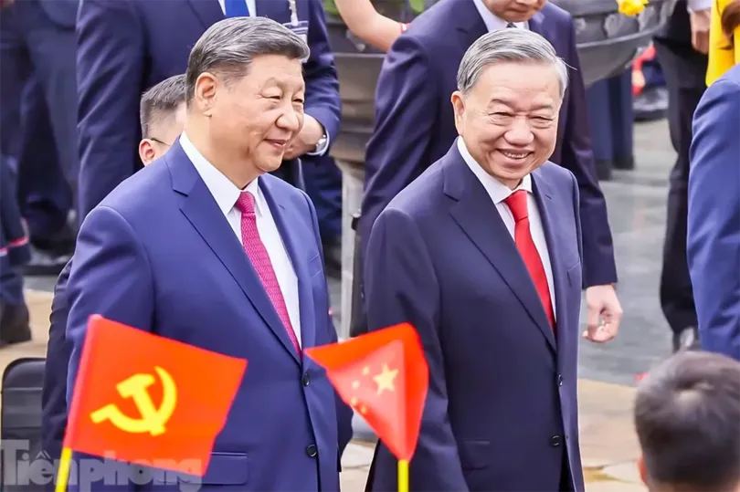 Tổng Bí thư Tô Lâm đón Tổng Bí thư, Chủ tịch nước Trung Quốc Tập Cận Bình trong chuyến thăm Việt Nam tháng 4-2025.