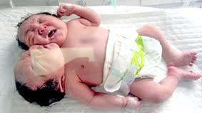 Một bé gái có đến 2 đầu vừa chào đời tại Bệnh viện Trung ương Toại Ninh, tỉnh Tứ Xuyên. Theo các bác sĩ, trường hợp này cực kỳ hiếm và là ca đầu tiên ở Trung Quốc. Kiểm tra ban đầu cho thấy bé có 2 đầu trên một thân mình, 2 cột sống và 1,5 trái tim. Vì các bộ phận khác đều chỉ có một nên bé không thể được tách ra.
