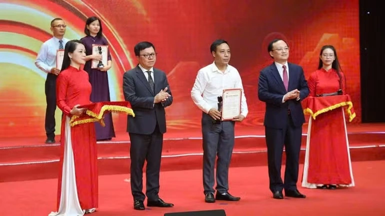 Đồng chí Lê Quốc Minh, Tổng Biên tập Báo Nhân Dân và đồng chí Đỗ Tiến Sỹ, Tổng Giám đốc Đài Tiếng nói Việt Nam trao Giải A cho các tác giả và nhóm tác giả đoạt giải.