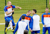 đều chuộng nó. Robben nói loại vòng đeo tay nhập khẩu từ Mỹ này giúp cơ thể anh cân bằng hơn khi chạy. Tất nhiên, khi thi đấu thì cầu thủ Hà Lan phải lấy dây vải quấn tay lại để tránh làm đau đối phương. Trong ảnh: Robben (bìa trái) với chiếc vòng đeo tay trên sân tập.