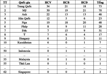 BẢNG TỔNG SẮP HUY CHƯƠNG OLYMPIC LUÂN ĐÔN 2012