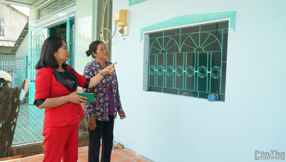 Bà Nguyễn Thị Thu Thảo, Bí thư Chi bộ, Trưởng ấp Thới Hiệp A (bên trái) kiểm tra tiến độ xây nhà Đại đoàn kết tặng bà Lê Kim Hiền, hộ nghèo trong ấp.