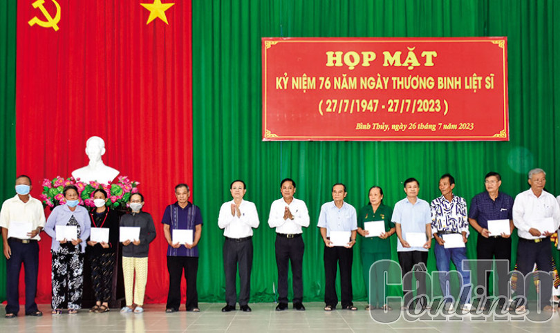 (CT) - Ngày 26-7, quận Bình Thủy tổ chức họp mặt, tặng quà 80 gia đình chính sách tiêu biểu nhân kỷ niệm 76 năm Ngày Thương binh - Liệt sĩ (27/7/1947-27/7/2023). Đồng chí Nguyễn Văn Hiếu, Ủy viên dự khuyết Ban Chấp hành Trung ương Đảng, Bí thư Thành ủy; đồng chí Nguyễn Văn Hồng, Phó Chủ tịch UBND thành phố; cùng lãnh đạo các sở, ngành thành phố và quận Bình Thủy đến dự.