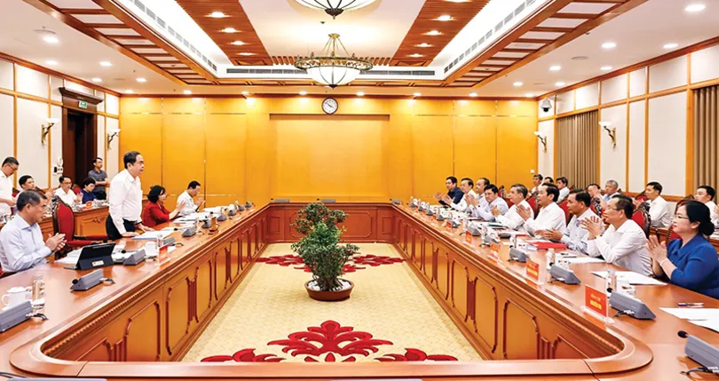Chủ tịch Quốc hội Trần Thanh Mẫn chủ trì làm việc với Ban Thường vụ Thành ủy Cần Thơ. Ảnh: Doãn Tấn - TTXVN