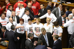 Các nghị sĩ đối lập tại Quốc hội Ukraina (áo sáng) phản đối quyết định ngừng các bước ký thỏa thuận thương mại với EU. Ảnh: NYTimes |