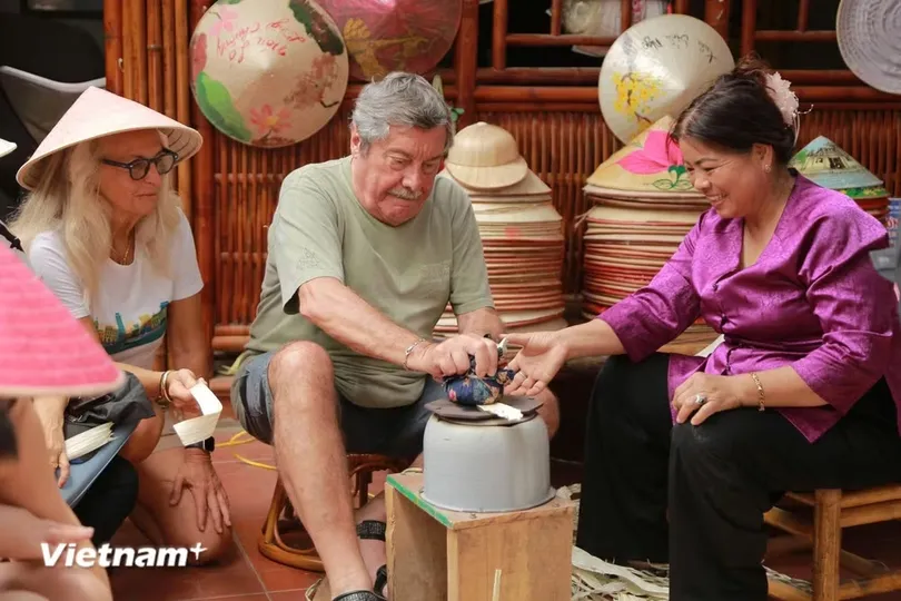 Du khách quốc tế trải nghiệm làm nón truyền thống ở Làng Chuông, Hà Nội. (Ảnh: Mai Huyền/Vietnam+)